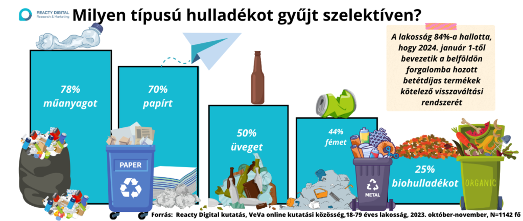 A felnőtt magyar lakosság többsége (87%) fontosnak tartja a szelektív hulladékgyűjtést, saját bevallása szerint 83 százalék elkülönítve gyűjt legalább egyféle hulladéktípust a vegyeshulladéktól. Az iskolai végzettséggel párhuzamosan növekszik a hulladékkezelési tudatosság is: míg az általános iskolai végzettségűek közül tízből csak heten szelektálnak valamilyen formában, addig a diplomások közül szinte mindenki. A könnyen elérhető szelektív hulladékgyűjtési megoldásoknak köszönhetően a lakosság a 78 százaléka külön válogatja a műanyag, 70 százaléka a papír hulladékot, 50 százaléka pedig a használt üvegeket. A lakosság 45 százaléka vissza is szokta váltani az erre alkalmas üvegeket – ez utóbbi inkább a férfiakra jellemző.