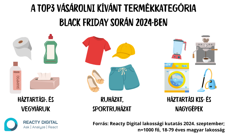 A népszerű termékkategóriákban nem volt jelentős változás, bár az első és második helyezett helyet cserélt az előző felméréshez képest: a vásárolni tervezők harmada (34%) háztartási- és vegyiárut tervez beszerezni, tízből hárman pedig ruházati terméket (31%), illetve háztartási kis- és nagygépet (29%). Szolgáltatás igénybevételén a vásárlást tervezők fele (54%) gondolkodik és – ahogy az előző évben – idén is elsősorban szállásfoglaláshoz (18%) szeretnék kihasználni a Black Friday kedvezményeit.