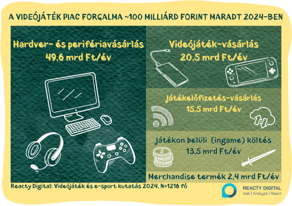 A videójátékosok éves költése 2024-ben körülbelül 100 milliárd forint volt, ami megegyezik az előző évi eredményekkel, tehát a piac összesítésben nem növekedett. Egyes részpiacok viszont tudtak növekedni az egy főre jutó költésekben: hardverekre, perifériákra, videójátékokra és előfizetésekre is többet költenek azok, akik erre rászánják magukat. Az alábbi cikk a Reacty Digital 2024-es Videójáték és e-sport kutatásának a gazdasági eredményeit mutatja be.